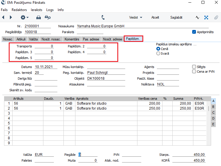 - No Pasūtījuma izveidotajās Saņemtajās precēs transporta izmaksas tiek ievadītas no pasūtījuma kājenē esošā Piegādes lauka. Ja tas ir tukšs – no moduļa Loģistika > reģistra Pasūtījumi > iedaļas “Papildizmaksas” Transporta izmaksu lauka (to proporcionāli sadalot starp rindām).