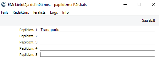 Pēc noklusējuma visas papildizmaksas Pasūtījumā būs bez precizējošiem nosaukumiem. Ja vēlaties nodefinēt papildizmaksu iemeslu (kā Transports piemērā augstāk), tad dodieties uz moduli Loģistika > iestatījumu Papildu lauku definēšana – papildizm. Šeit lauku nosaukumus var aizstāt ar sev vēlamajiem.