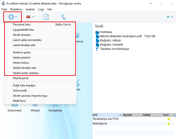 Windows versijā Navigācijas centra kreisajā augšējā stūrī ir Darbību (“zobrata”) izvēlne, kas ietver nepieciešamās funkcijas pielikumu pievienošanai, atvēršanai un noņemšanai.
