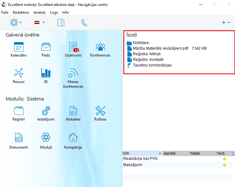 Reģistrus: Aizvelciet reģistrus no Navigācijas centra uz Personīgo darba virsmu. Līdzīgā veidā uz darba virsmu ir iespējams aizvilkt iestatījumus, dokumentus, importa un eksporta funkcijas, apkalpošanas. Atveriet vēlamo sarakstu (piemēram, Atskaišu vai Dokumentu sarakstu) un aizvelciet nepieciešamo objektu uz Personīgo darba virsmu.