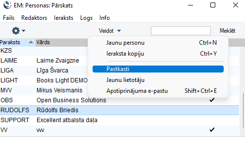 Lai izmantotu šo funkciju, iepriekš ir jābūt izveidotai lietotāja Pastkastei. Ja Pastkastes nav, tad to var pievienot modulī Sistēma > Reģistri > Personas > atzīmējot vajadzīgo personu un izvēloties Veidot – Pastkasti.