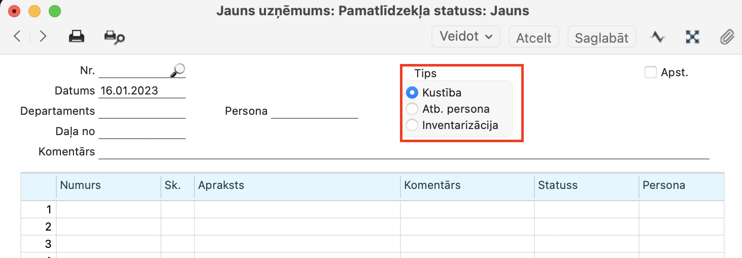 3. Veidot Pamatlīdzekļu inventarizācijas sarakstu izveidojot jaunu ierakstu ar Tipu “Atbildīga persona”