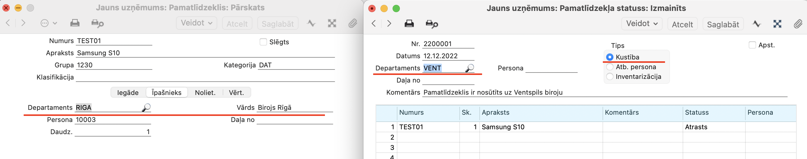 Piemēram, ar numuru TEST01 Pamatlīdzekļa kartītē ir norādīts departaments RIGA (Birojs Rīgā), bet to vajadzētu nomainīt uz departamentu Ventspilī (VENT – Birojs Ventspilī). Jums jāizveido jaunu ierakstu ar Tipu “Kustība”, kurā jānorāda jauno departamentu izvēloties no saraksta.