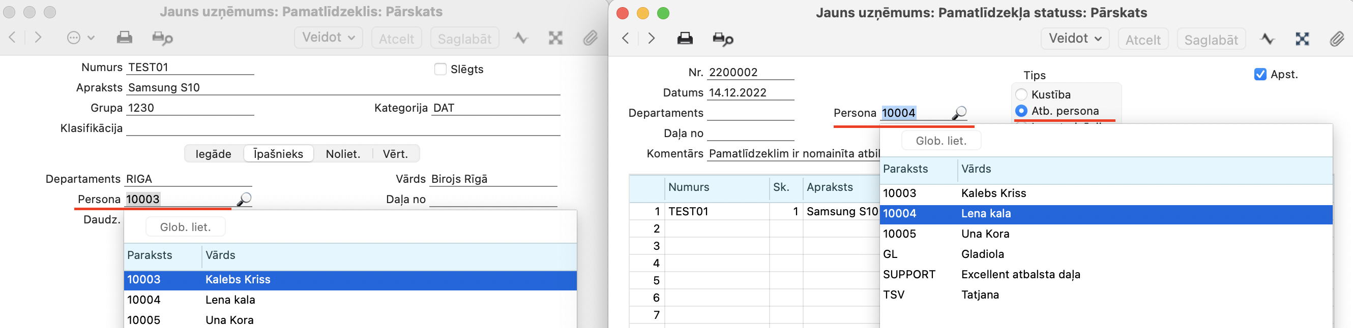 Piemēram, ar numuru TEST01 Pamatlīdzekļa kartītē ir norādīta Persona 10003 (Kalebs Kriss), bet vajadzētu nomainīt uz 10004 (Lena Kala) . Jāizveido jaunu ierakstu ar Tipu “Atbildīga persona”, kurā jānorāda jauno Personu izvēloties no saraksta.