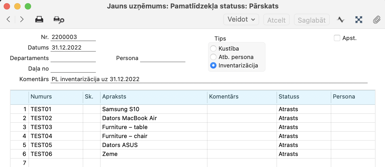Programma izveidos ierakstu, ievietojot visus esošos pamatlīdzekļus, kurā varēsiet aizpildīt inventarizācijas rezultātus.