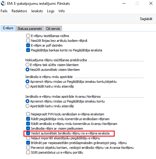 Pārbaudiet vai Sistēmas modulī > iestatījumos E-pakalpojumu iestatījumos > ir atzīmēts Veidot automātiski Ienākošo rēķinu no e-rēķina ieraksta.