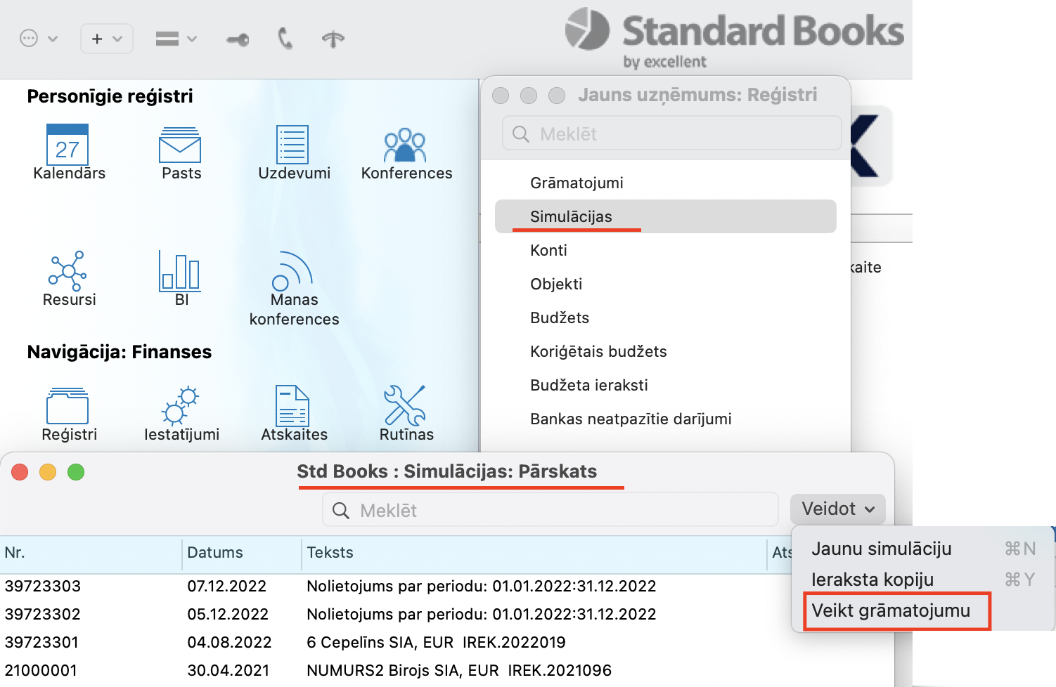 No simulācijas ir iespējams izveidot grāmatojuma ierakstus modulī Finanses > Reģistri > Simulācijas > atvērtajā logā Simulācijas: Pārskats > izmantojot izvēlni Veidot – Veikt grāmatojumu.