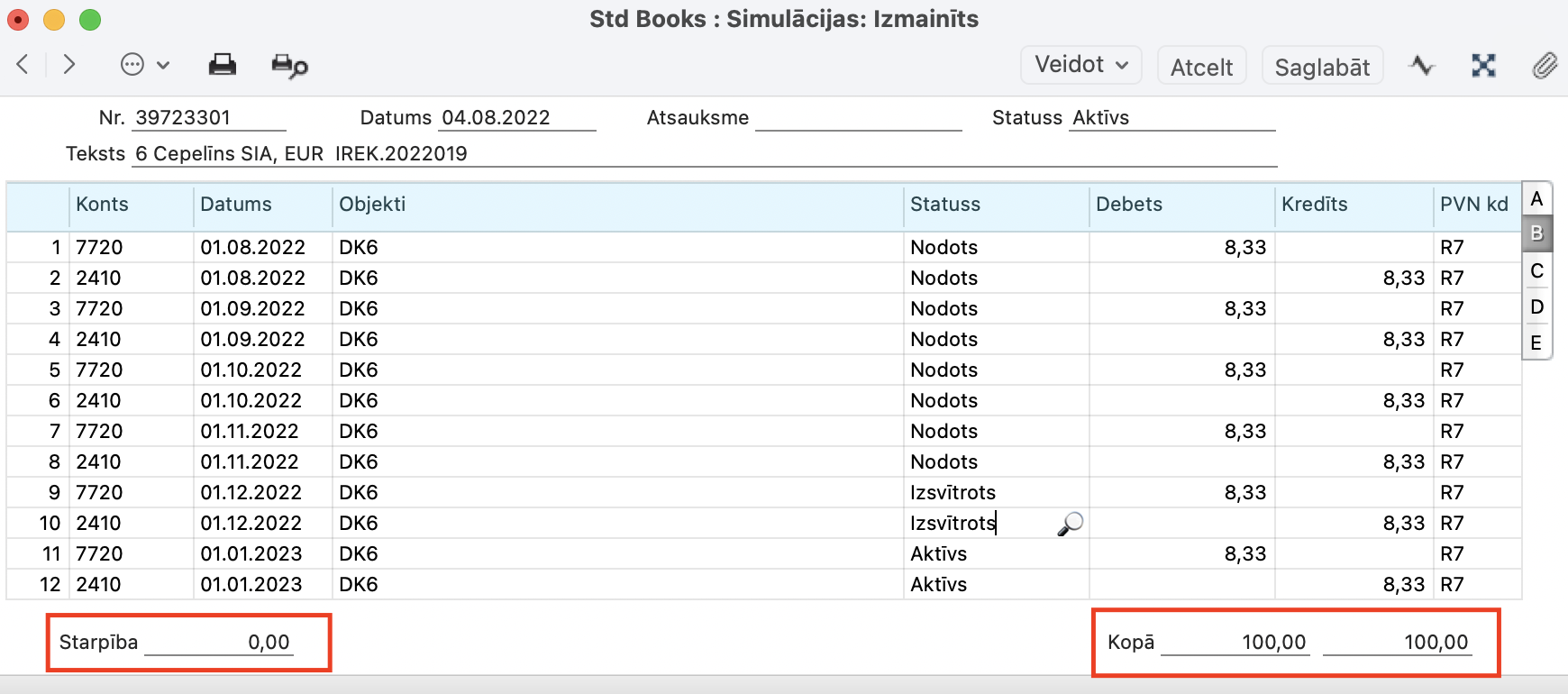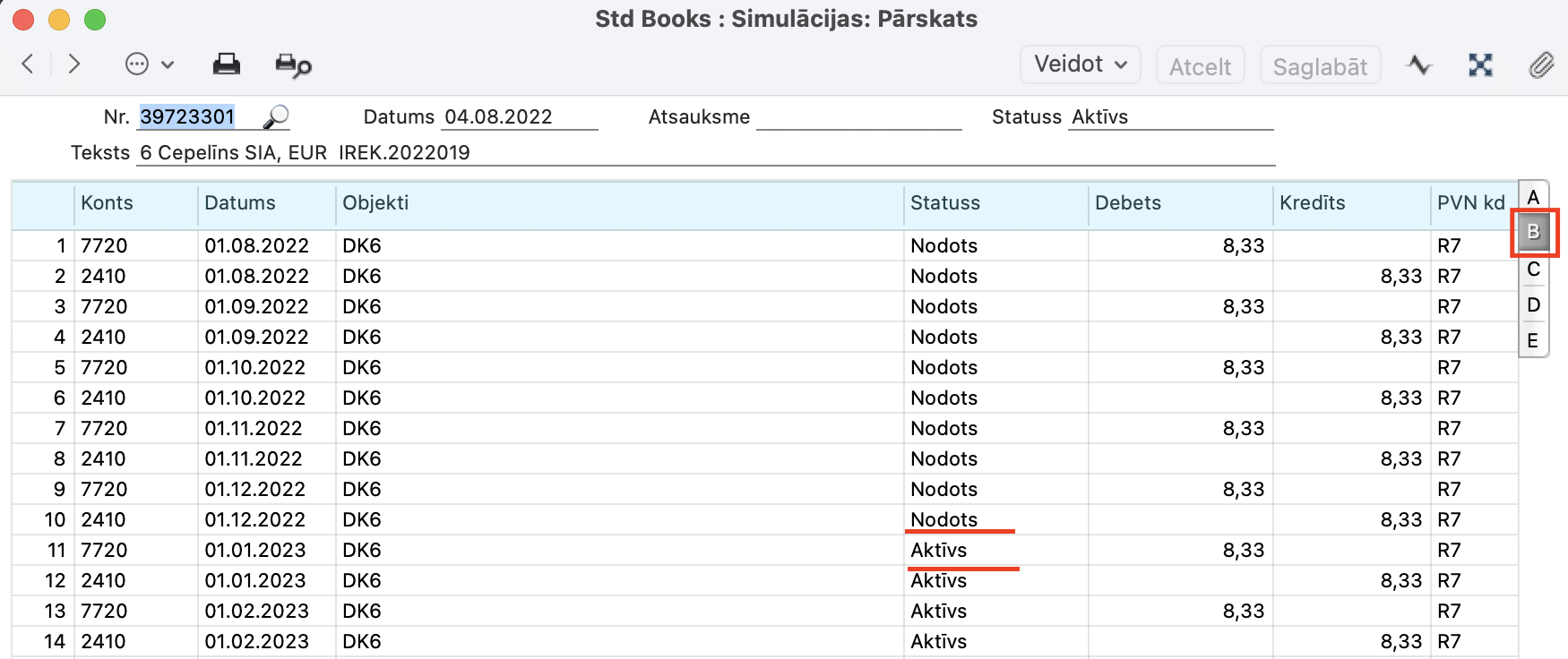Simulācijas ieraksta sadaļā “B”, kolonnā “Statuss” ir iespējams redzēt, vai no simulācijas rindas ir vai nav jāizveido grāmatojums.