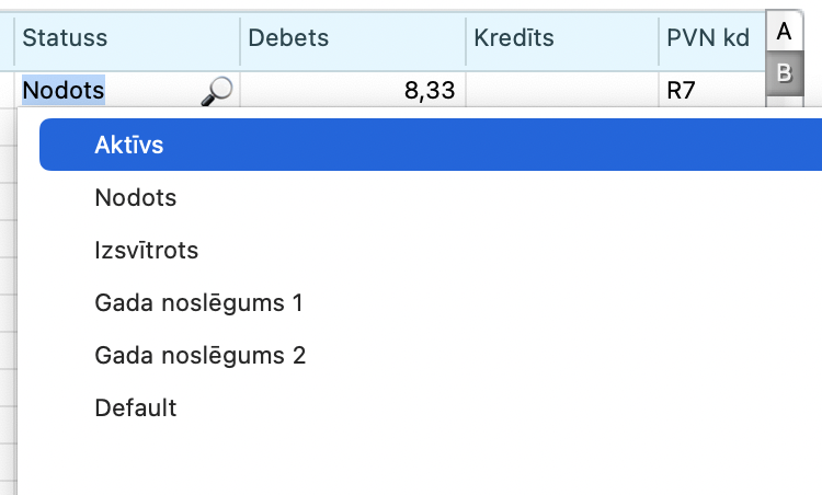 Gada noslēgums 1, Gada noslēgums 2 – šie statusi ļoti līdzinās statusam “Aktīvs”. Atšķirība ir tikai tā, ka rindas, kurām ir atšķirīgs statuss, var iekļaut vai atstāt neiekļautas Finanses > Atskaites >Apgrozījuma pārskatā un Galvenās grāmatā.