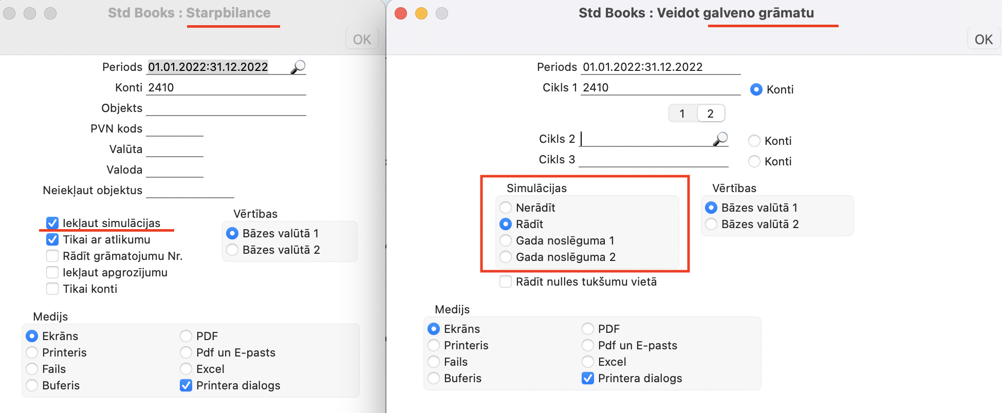 Atzīmējot atbilstošo izvēli, simulācijas ieraksta rindas ar šo statusu tiek iekļautas citās atskaitēs pēc noklusējuma.