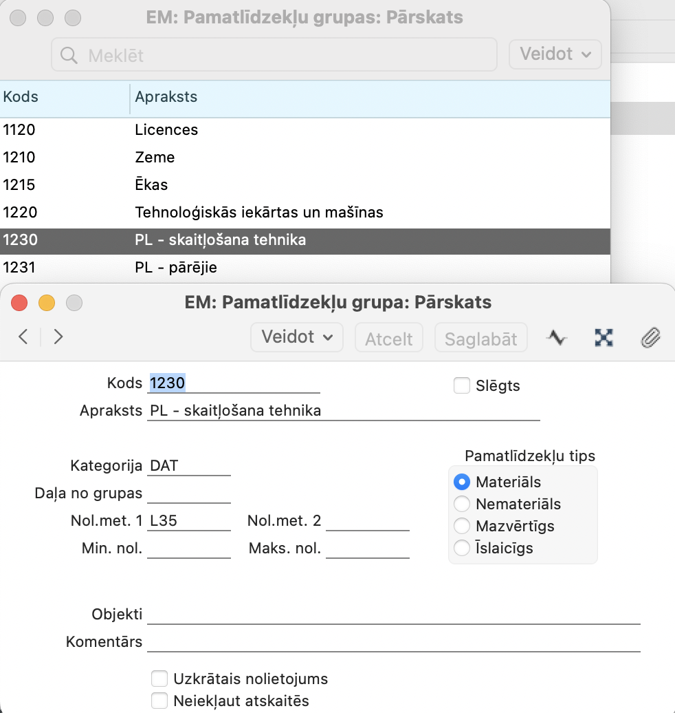 - Ja šeit ir norādīts objekts, tas tiks automātiski ievietots pamatlīdzekļa ierakstā, tiklīdz to piesaistīs konkrētajai grupai. Iespējams ievadīt vairākus objektus, atdalītus ar komatu.