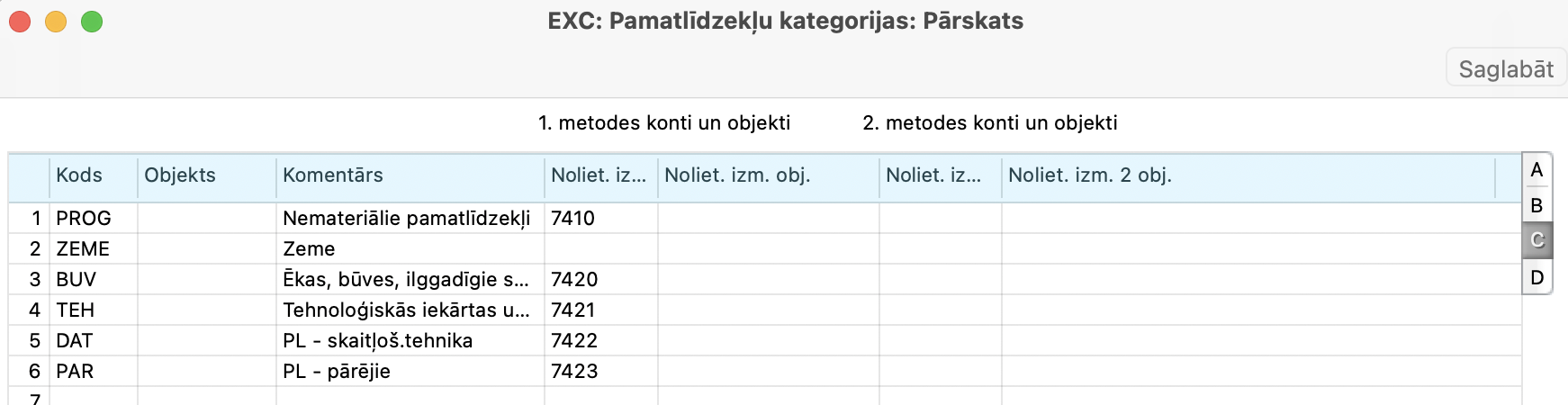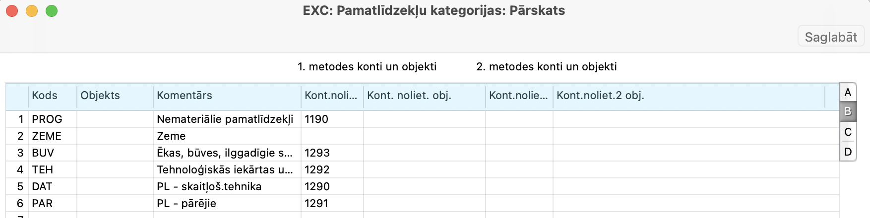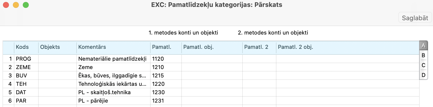 Atvērtajā tabulā ievadiet Kodu, kas raksturo attiecīgos pamatlīdzekļus, piemēram, Nemateriālie pamatlīdzekļu gadījumā – PROG. Komentāru laukā ierakstiet, piemēram, “Nemateriālie pamatlīdzekļi”, bet Pamatlīdzekļu laukā – pamatlīdzekļu konta numuru no bilances, piemēram, 1120.