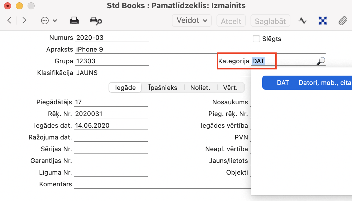 Pamatlīdzekļu kategorijas iestatījums tiek ievietots katrā Pamatlīdzekļi > Reģistri > Pamatlīdzekļi> Pamatlīdzekļu kartītē, kas norāda programmai uz kādiem kontiem jāveic konkrēta pamatlīdzekļa grāmatošanu.