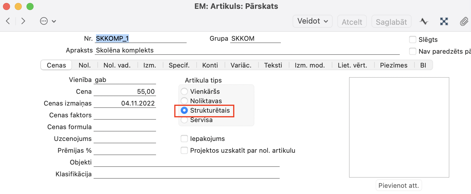 - Jāizveido artikulu ar Artikula tipu – Strukturētais. Tieši šis artikuls sevī iekļaus visu iepriekš sagatavoto Skolēna komplektu. Šeit jānodefinē arī cena par šo komplektu.