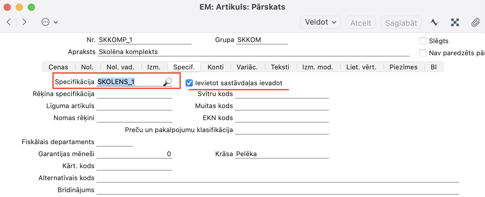 - Sistēma jums neatļaus Saglabāt ierakstu, kamēr netiks aizpildīts lauks Artikulu ierakstā, sadaļā Specifikācija.