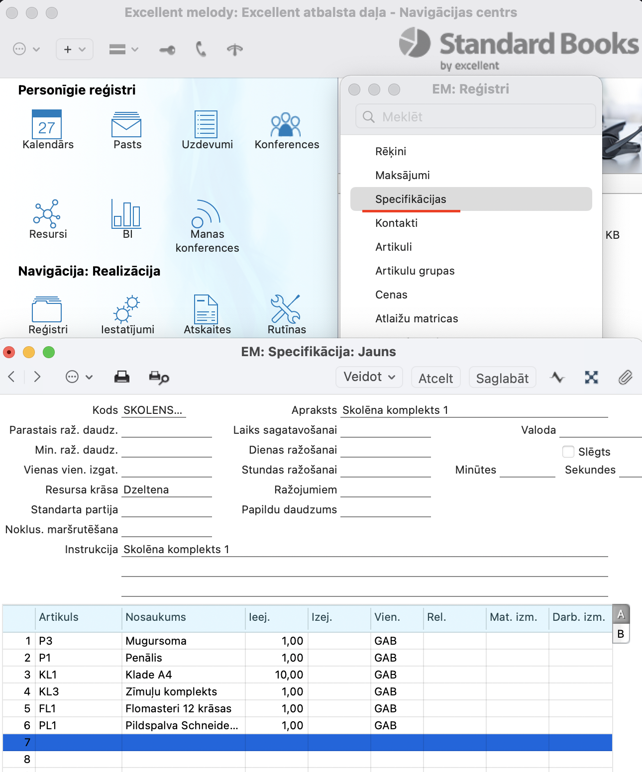 1. Solis – modulis Realizācija > Reģistri > Specifikācijas > Veidot – Jauna specifikācija. Tas ir ieraksts no kā sastāvēs Skolēna komplekts.