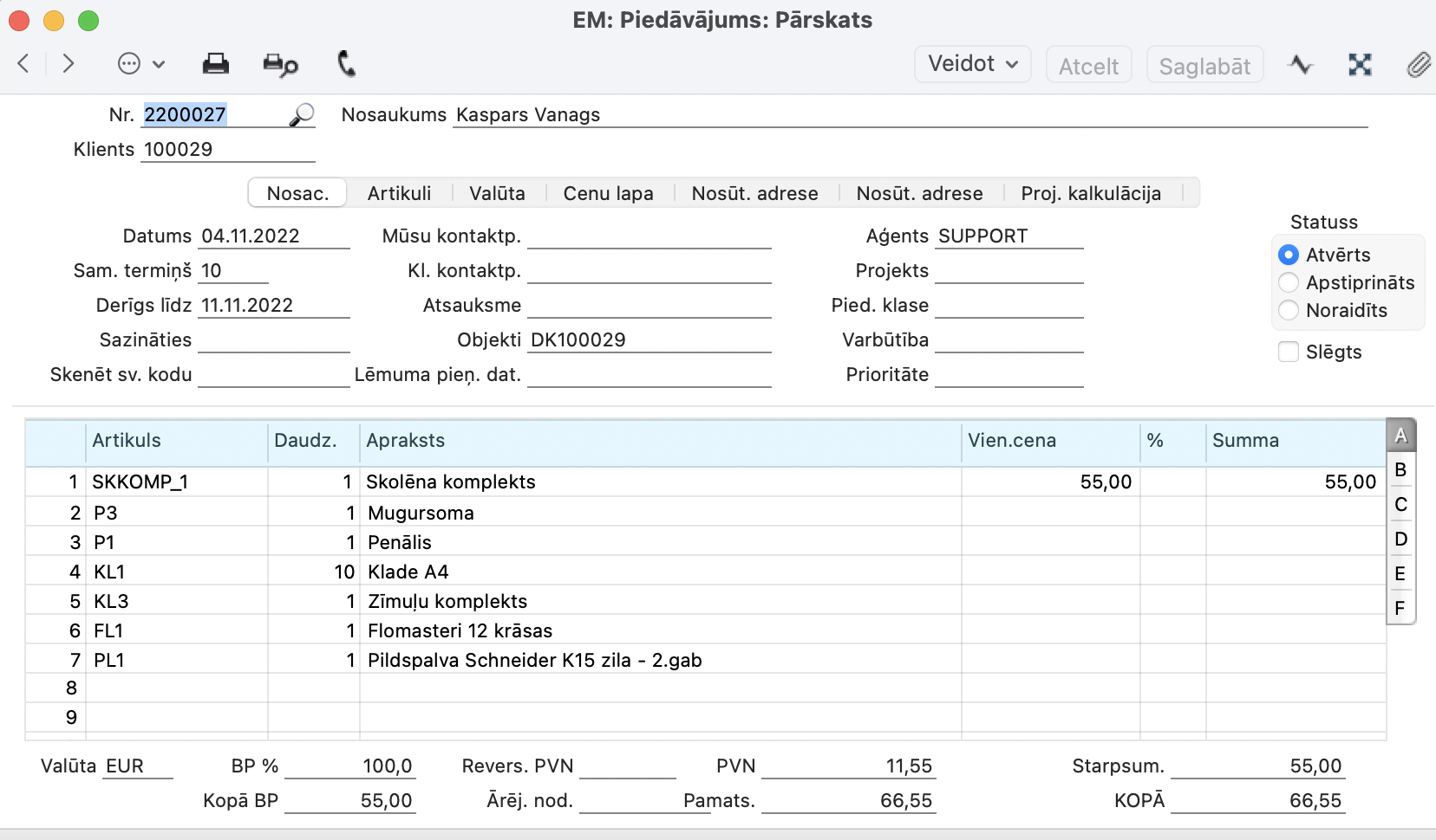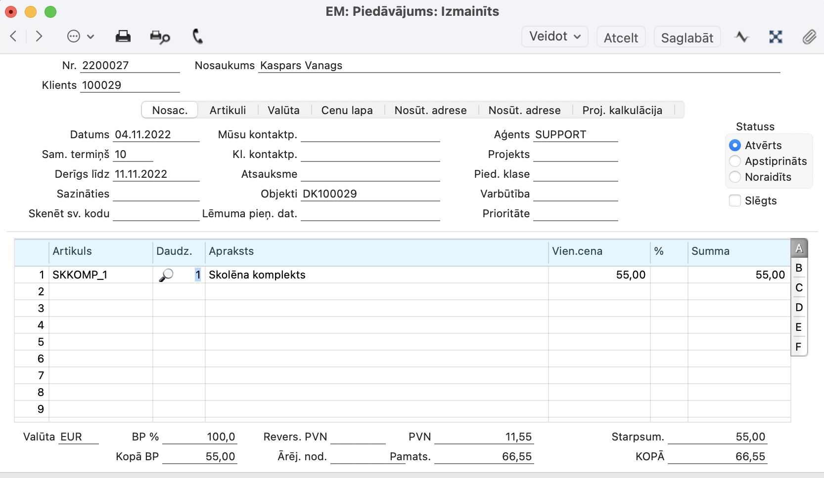 - Saglabājiet Specifikācijas ierakstu un tagad varat veidot klienta piedāvājumu, klienta pasūtījumu utt.
