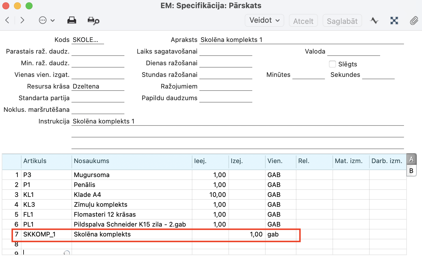 - Iepriekš specifikācijā tika norādītas komplekta sastāvdaļas. Tagad lai pabeigtu specifikāciju, jānorāda Artikuls, zem kurā visas šīs sastāvdaļas tiks ietvertas. Tāpēc šajā piemērā tabulā jāievieto Artikulu “SKKOMP_1”, kurz tika izveidots 2. Solī.