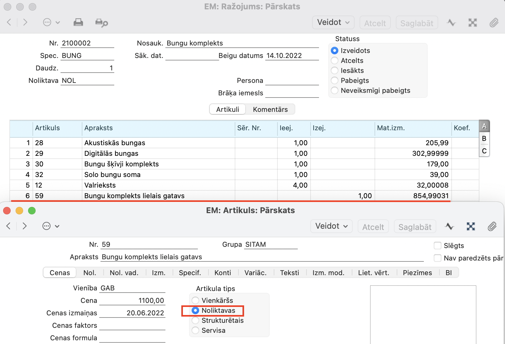 B) Ja jums ir ražošana, un jūs veidojat komplektus no produkcijas, kuru paši saražojāt, tad jāizmanto Ražošanas modulis. Princips komplektēšanai paliek līdzīgs, izņemot to, ka Artikuls, zem kura tiks saliktas komplekta sastāvdaļas, būs ar Artikula tipu “Noliktavas”.