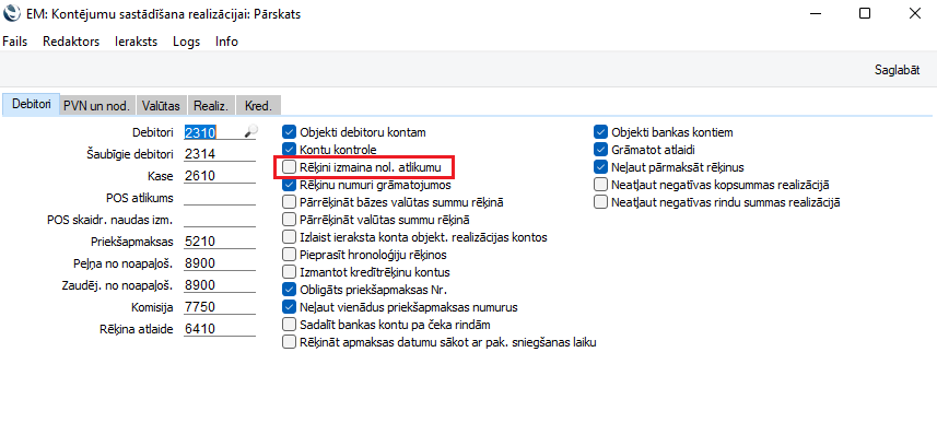 Ko darīt, lai izvēles lauks “Izmainīt nol.atlikumu” nebūtu atzīmēta pēc noklusējuma, kad tiek izveidots jauns realizācijas rēķins?