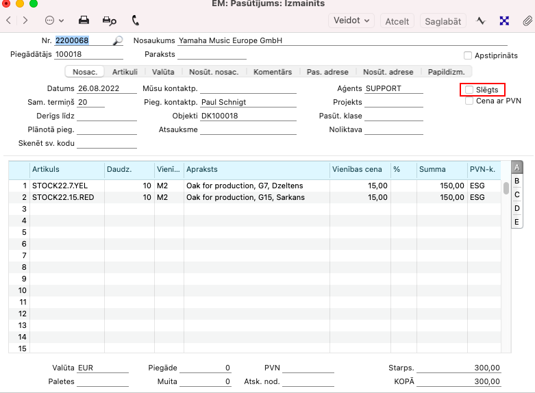 Modulī Loģistika > reģistrā Pasūtījumi atzīmējiet šo izvēli tad, ja Pasūtījums ir pilnībā pabeigts. Slēgtu pasūtījumu nav vairs iespējams mainīt. Ja Pasūtījums ir daļēji izpildīts un pasūtījums tiek slēgts, tad atlikušie daudzumi tiek atcelti, un tie vairs netiks atspoguļoti pārskatos. Slēgtu pasūtījumu no jauna atvērt nav iespējams.