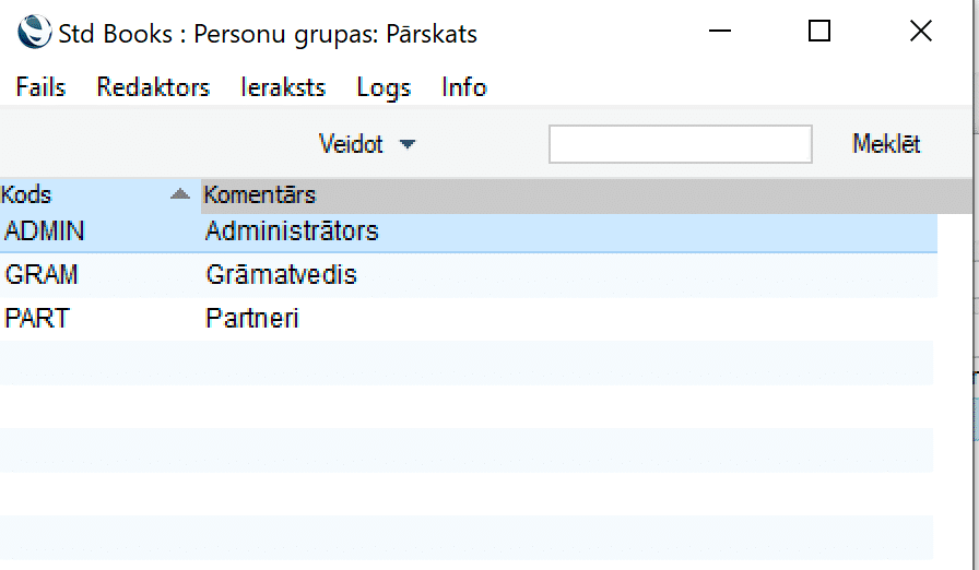 Katrā konkrētajā grupā ir iespējams piešķirt vai atņemt dažādas tiesības darbībai programmā. Lai piemērotu grupas uzstādījumus, kods (piemēram, ADMIN) ir jāievada Personas reģistrā pie Personas grupas. Personai iespējams izsniegt vairākas Personu grupu piekļuves tiesības, atdalot tās ar komatu.