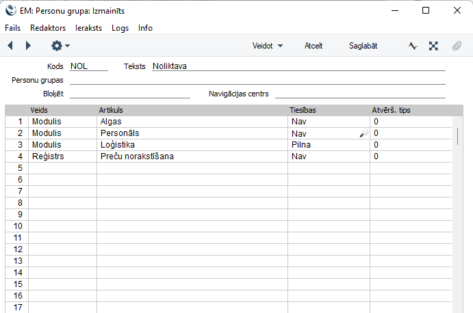 Ja personai ir “Bez pieejas līmenis”, tad iespējams izveidot grupu, kas dos tiesības redzēt un darboties tikai ar kādu konkrētu moduli, reģistru, iestatījumu, atskati, utt.