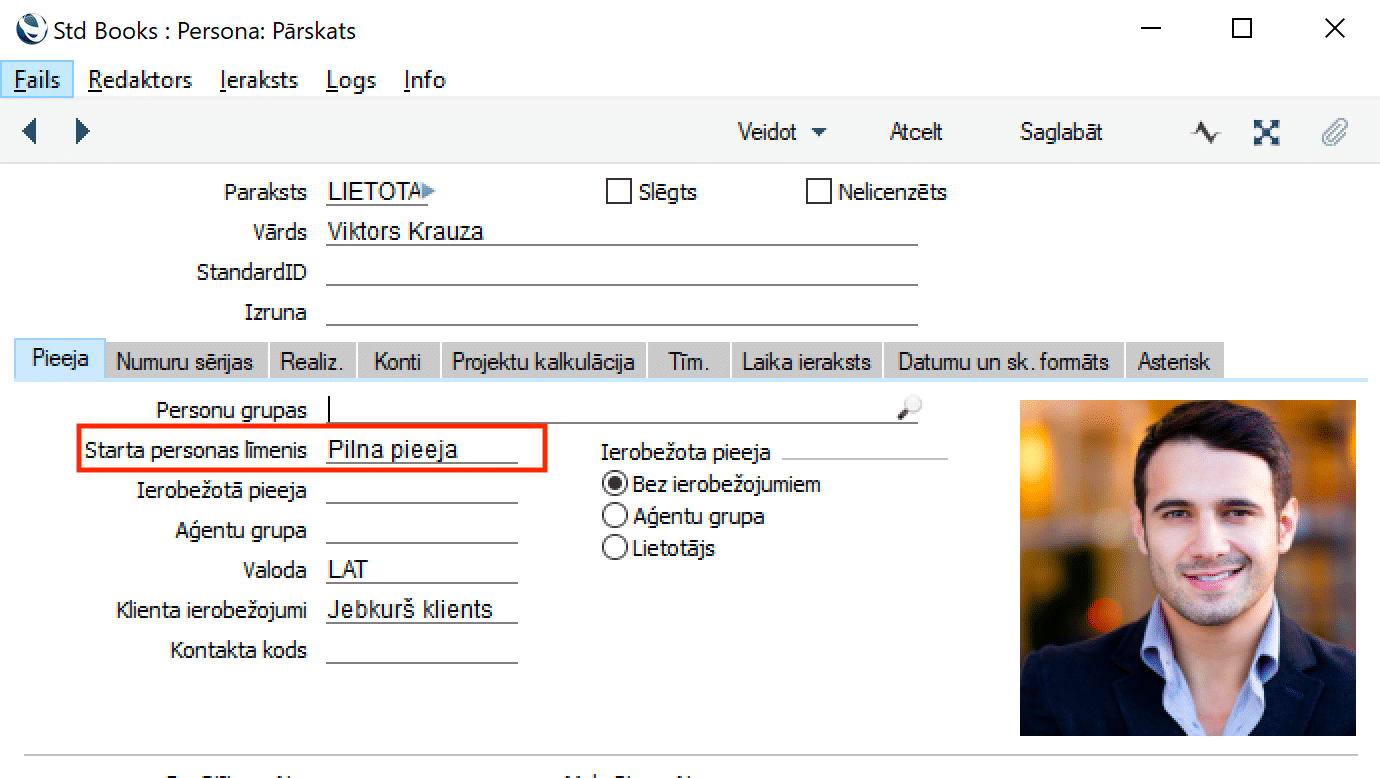 Personas reģistrā Lietotājam var izsniegt vai nu programmas bāzes pamata pilnu pieeju vai aizliegt piekļuvi pilnīgi visam (bez pieejas) un atļaut tikai atsevišķas darbības ar Personu grupas iestatījuma palīdzību.