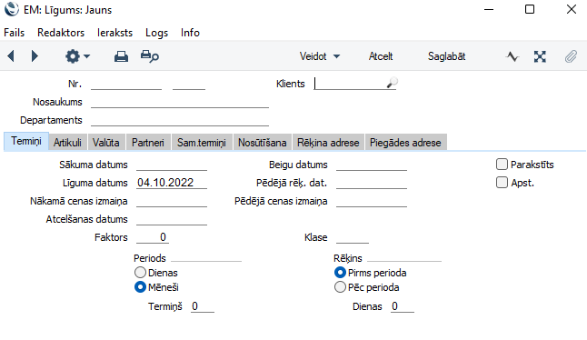 Atverot moduli Norēķini pēc līgumiem > Reģistri > Līgumi noklikšķiniet uz pogas “Veidot” – “Jauns līgums” vai izmantojiet taustiņu kombināciju Ctrl-N (Windows un Linux) vai ⌘-N (Mac).
