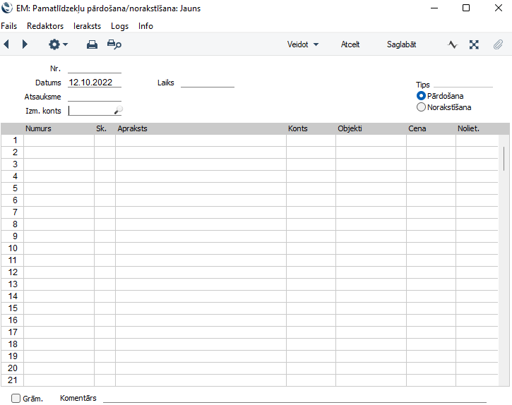 Datums – Norakstīšanas dokumenta datums, pēc noklusējuma tiek ievadīts pašreizējais datums.