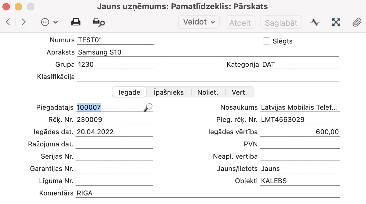 Piemērs, uzņēmums 20.04.2022 iegādājas mobilo tālruni Samsung S10
