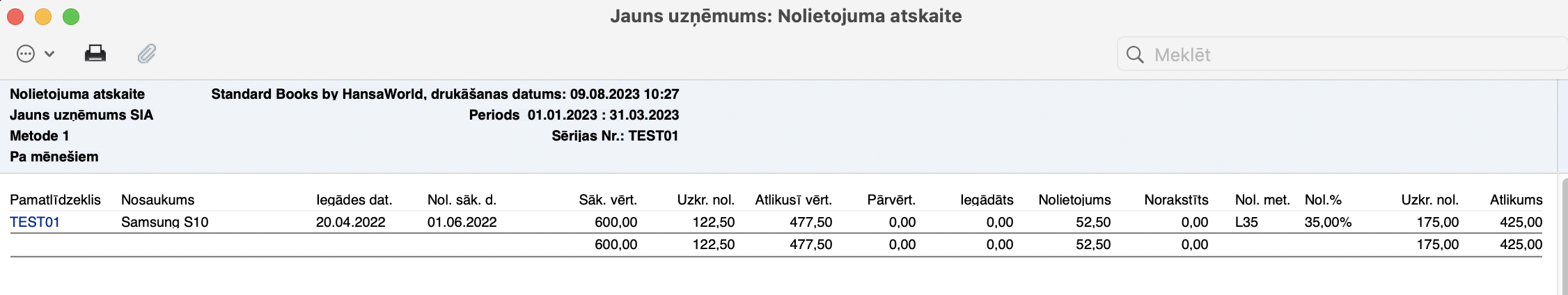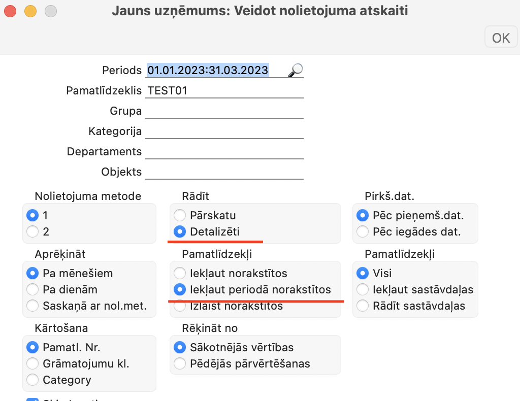 Šādi izskatīsies Nolietojuma atskaite (ar parametriem: rādīt Detalizēti, Iekļaut periodā norakstītos) pēc Norakstīšanas.