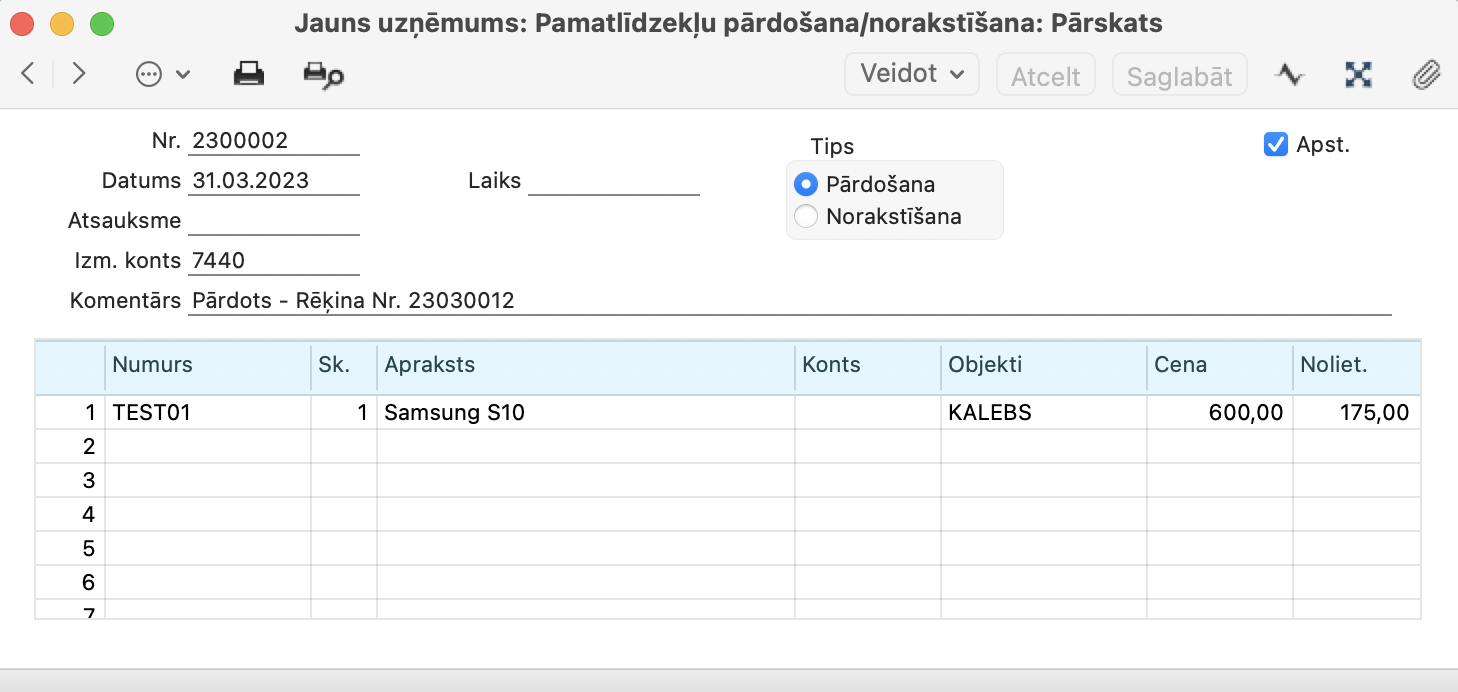 Skaits – Pārdodamais vai norakstāmais daudzums tiek ievadīts no Pamatlīdzekļu kartes. Ja nepieciešams, variet to mainīt.