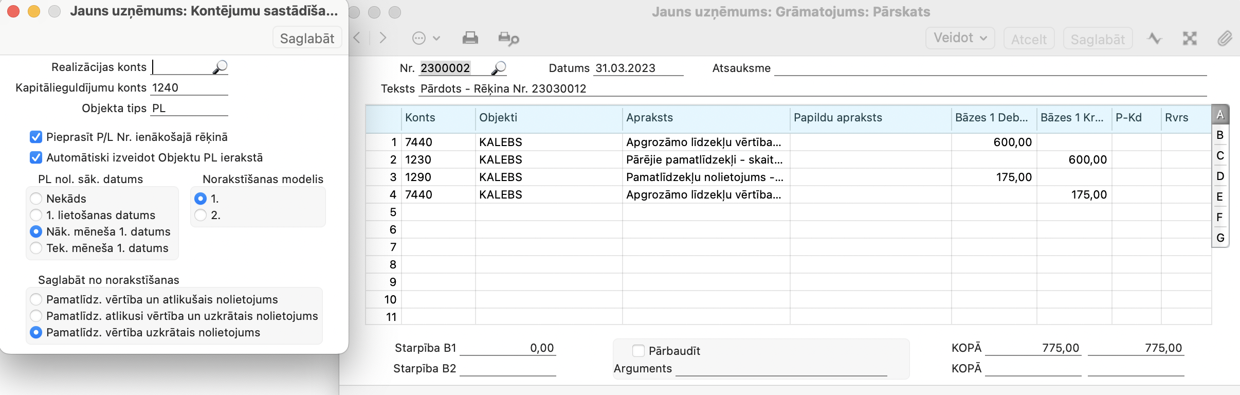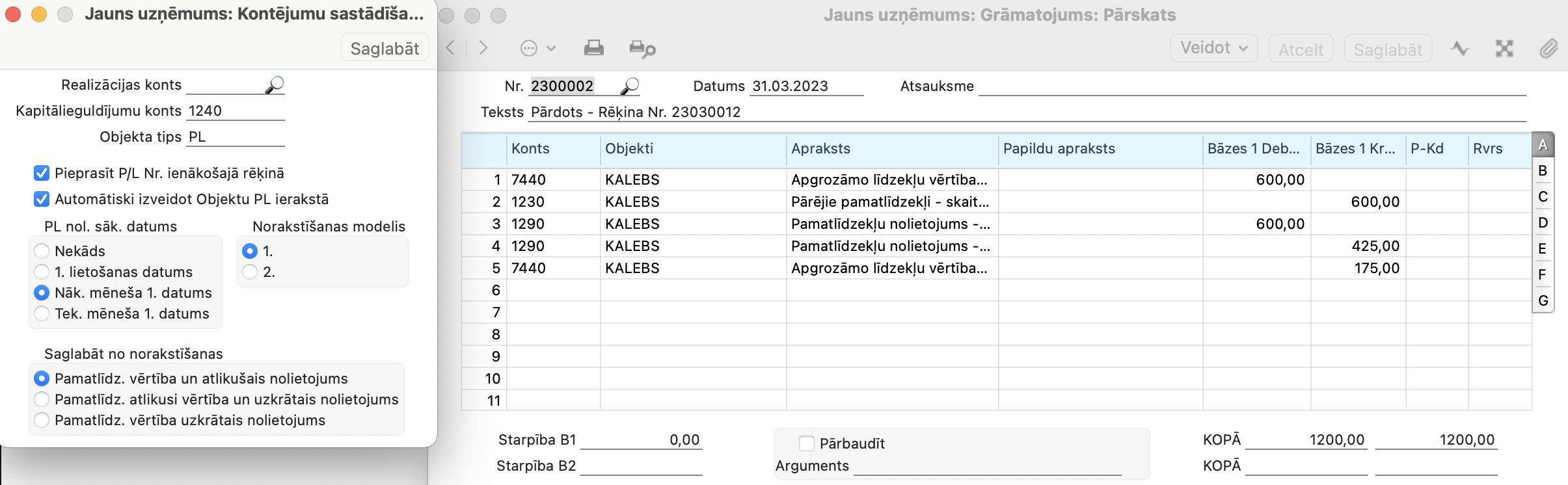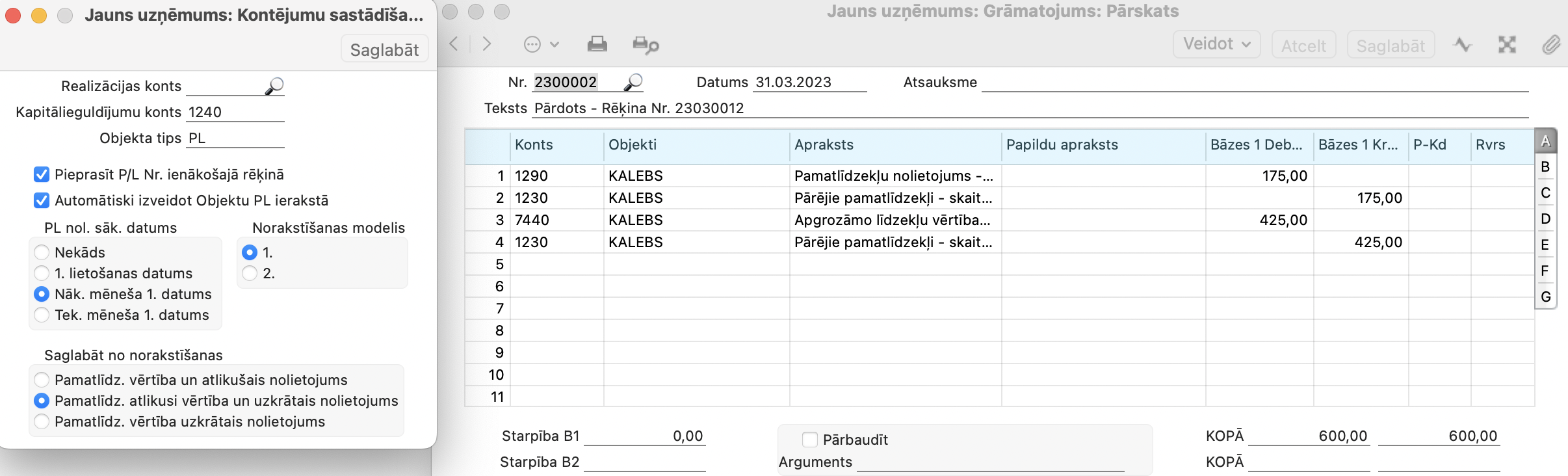 Atkarīgi no tā, kādu norakstīšanas veidu no trim piedāvātiem jūs izvēlēsieties Pamatlīdzekļi > Iestatījumi > Kontējumu sastādīšana pamatlīdzekļiem, tā programma veidos Norakstīšanas grāmatojumu.