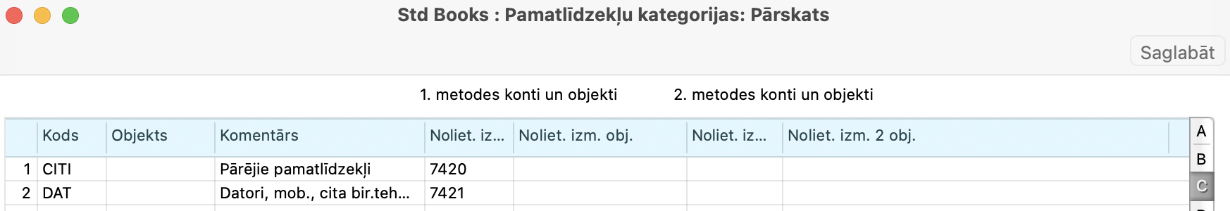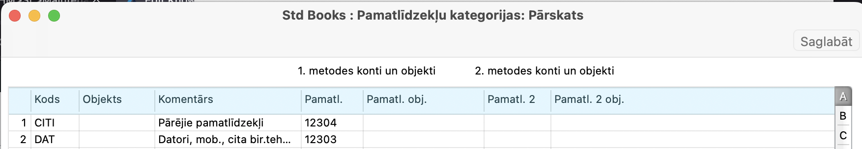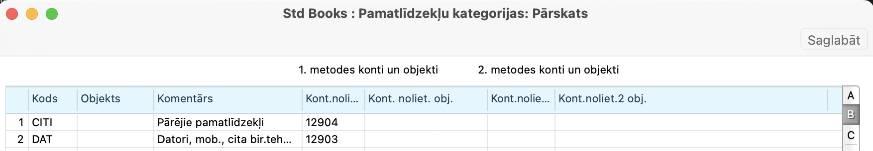2. Vai Pamatlīdzekļi > Iestatījumi > Pamatlīdzekļu kategorijas> sadaļās A, B un C ir atzīmēti konti, uz kuriem programmai jāgrāmato.