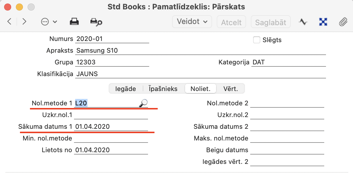 4. Vai Pamatlīdzekļi > Reģistri > Pamatlīdzekļi > Pamatlīdzekļu kartē > sadaļā Nolietojums ir atzīmēts pareizais Sākuma datums un pareiza Nolietojuma metode 1.