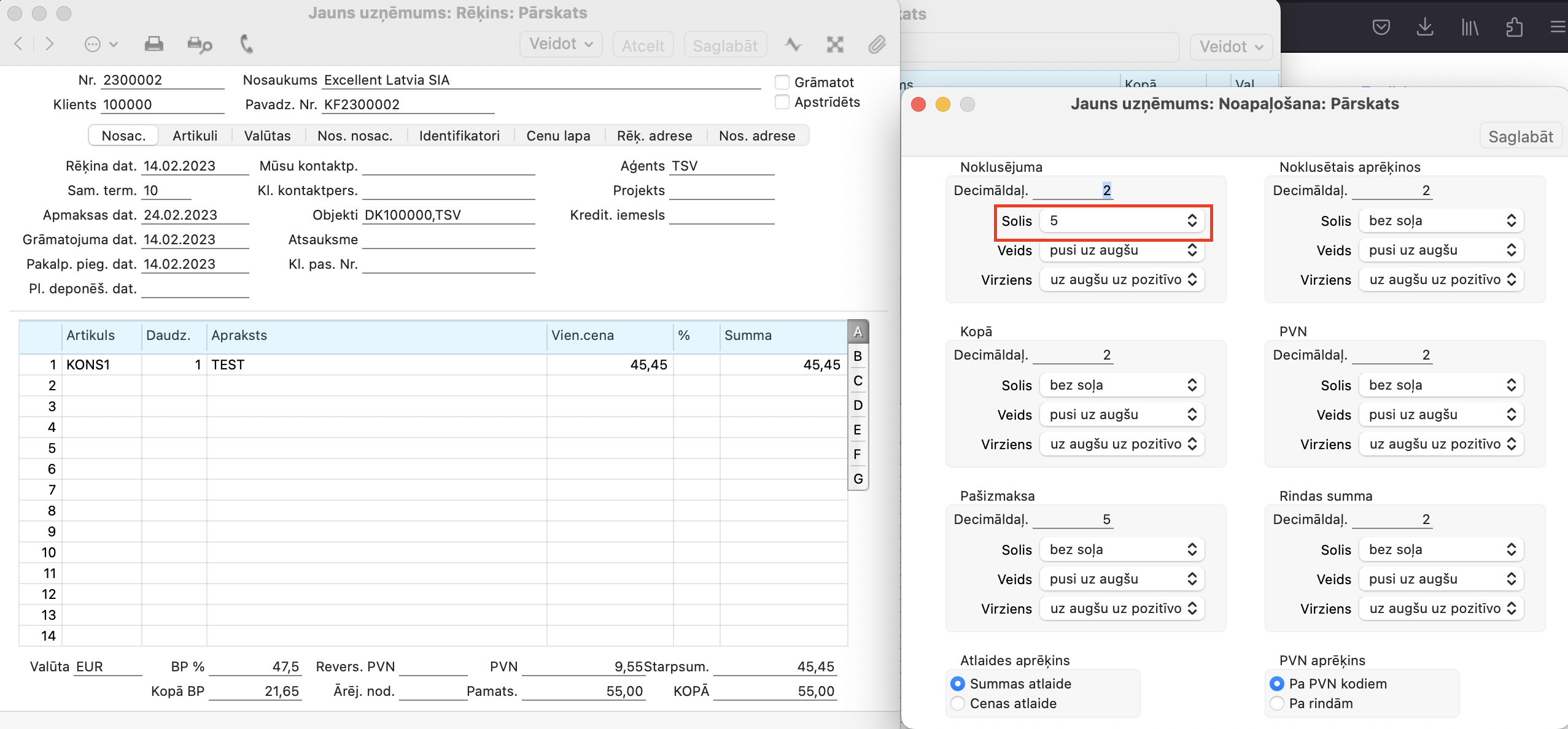 Šīs opcijas kontrolē noapaļošanu, kas tiek izmantota, aprēķinot skaitļus, kas parādīti laukā “Summa” (Daudzums X Vienības cena) visās matricās un attiecīgi arī laukā “Starpsumma” zem matricām. Aiz komata zīmju skaits nedrīkst pārsniegt iepriekš norādīto Noklusējuma decimāldaļu skaitu.