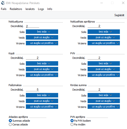Logā ir sešas sadaļas, kurās varat norādīt, kā konkrēti skaitļi tiks noapaļoti (Noklusējuma, Noklusētais aprēķinos, Kopā, PVN, Pašizmaksa un Rindas summa). Katrā sadaļā ir viena un tā pati opciju kopa, kas kontrolē noapaļošanas procesa darbību. Vispirms aprakstīsim šīs opcijas (lauks Decimāldaļas, Solis, Veids un Virziens) un pēc tam loga sadaļas.