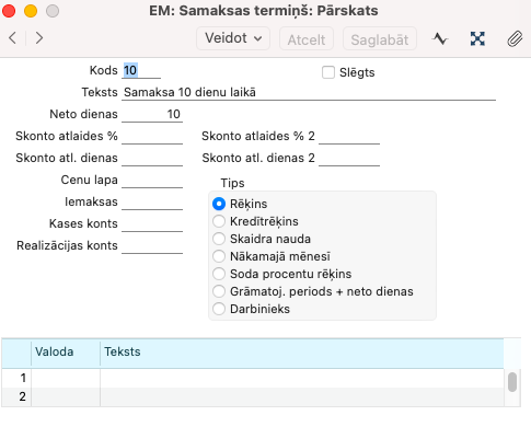 B) modulis Realizācija > Iestatījumi > Samaksas termiņi