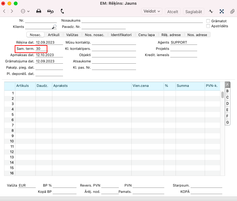 Veidojot jaunu Realizācijas rēķinu, automātiski aizpildīsies lauks “Samaksas termiņš”.