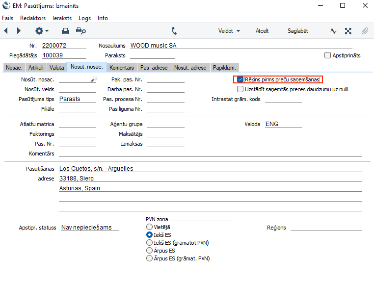 Ja vēlaties rēķinu ievadīt pirms Noliktavas preču saņemšanas, tad pasūtījuma sadaļā “Nosūtīšanas nosacījumi” atzīmējiet izvēli “Rēķins pirms preču saņemšanas”.
