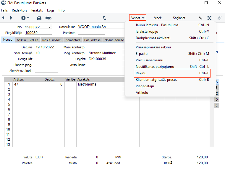 Moduļa Loģistika > reģistrā Pasūtījumi > izvēlnē Veidot var izmantot izvēli “Rēķins” tikai tad, ja no pasūtījuma ir iepriekš sastādīta un apstiprināta vismaz viena preču saņemšana uz Noliktavu.