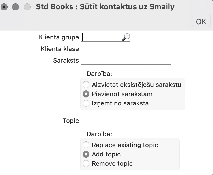 Ja vēlaties pārsūtīt daudz kontaktu uz Smaily vidi, Books programmatūrā ir izveidota apkalpošana: modulis CRM > Rutīnas > Apkalpošana > Sūtīt kontaktus uz Smaily.