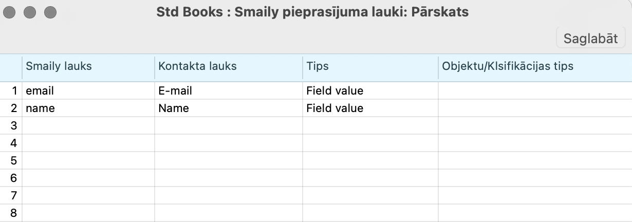 Smaily lauks – lietotājs kolonnā, ko izmantos Smaily vide, ievadīs lauka nosaukumu (Lauks nav iepriekš jāizveido Smaily. Būs vaicājums izveido jaunus laukus, ja tie nepastāv)