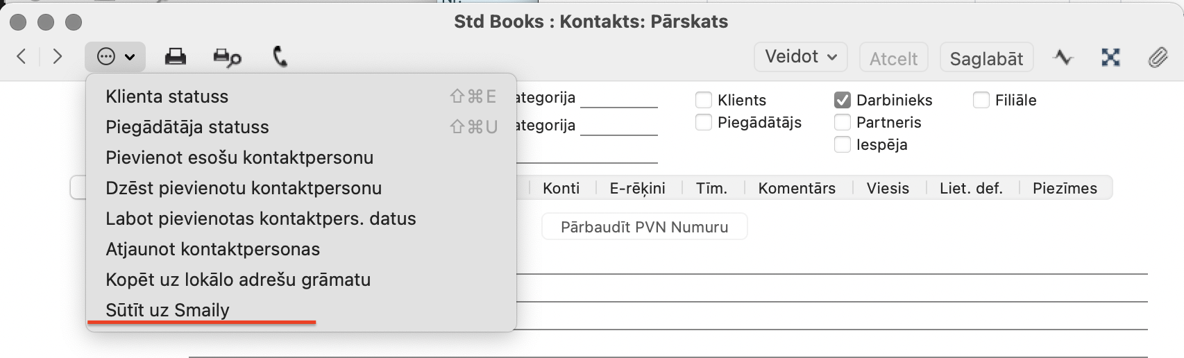 Funkcionalitātes izmantošanas priekšnoteikums ir tas, ka e-pasta adreses ir pareizi aizpildītas kontaktu kartītēs. Ja Standard Books kontaktpersonas kartē nav e-pasta adreses, šī kontaktpersona netiks pārsūtīta uz Smaily. Turklāt laukā “E-pasts” nedrīkst būt cita vērtība, izņemot e-pasta adresi. E-pasta adrese laukā “E-pasts” jāievada e-pasta formātā vai arī tā var būt tukša.