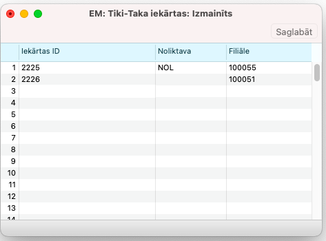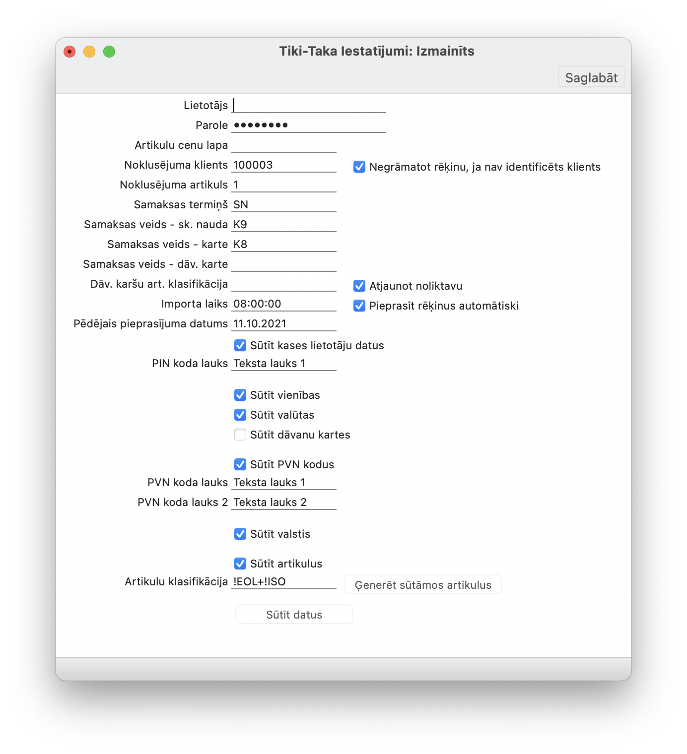Pēc iesatījumu maiņas jāsaglabā Tiki-Taka iestatījumi, jāatver atkārtoti un jānospiež “Ģenerēt sūtāmos artikulus”, bet pogu “Sūtīt datus” izmantot tikai tad, kad veikti tālākie iestatījumi, lai izvēlētos, kurus tieši ierakstus sūtīt.