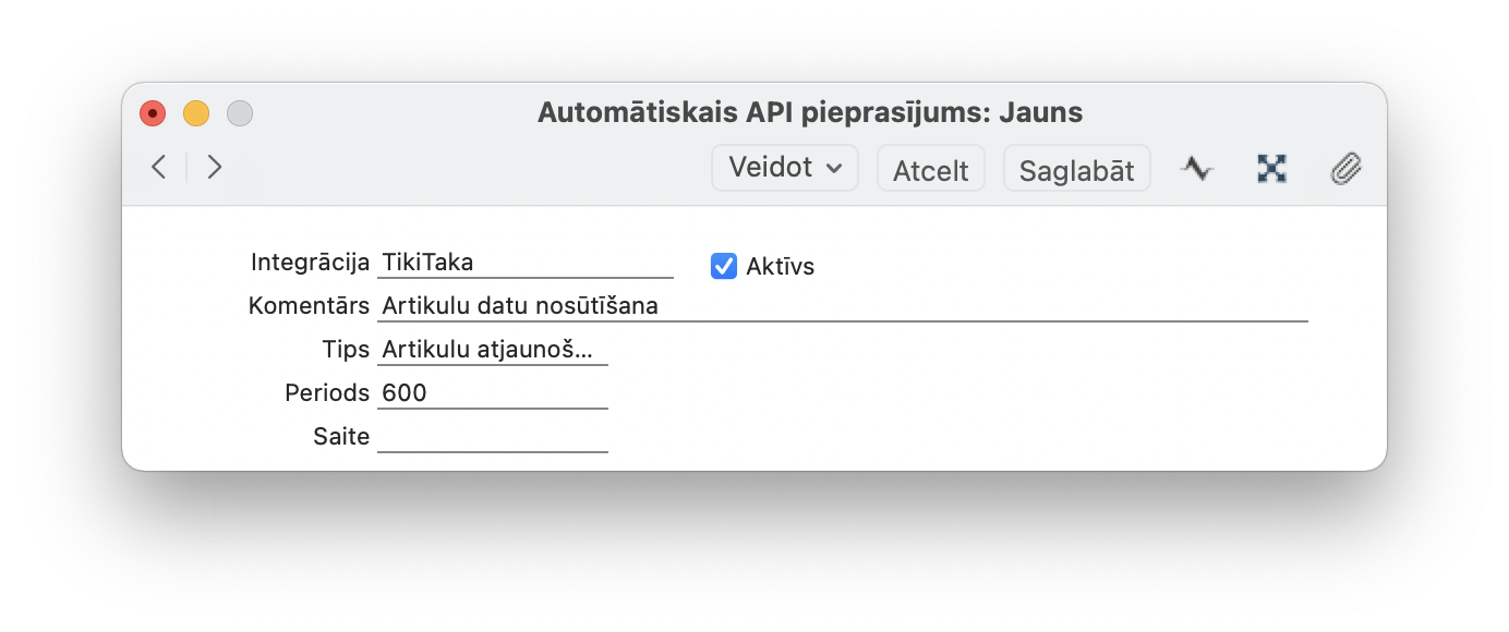 Periods: pēc cik sekundēm pārbaudīt vai ir jāsūta dati, proti, vai ir kādas izmaiņas artikulos, kas nav nosūtītas. Šo statusu var redzēt API ierakstu konfigurācija iestatījumā kolonnā “Atjaunots”.