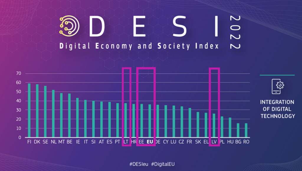 Digitālās ekonomikas un sabiedrības indekss (DESI) rāda, ka Latvijā uzņēmumi digitālo tehnoloģiju integrēšanas jomā būtiski atpaliek no ES vidējā rādītāja, ierindojoties tikai 23. vietā starp 27 ES dalībvalstīm. Aktīvāk digitālos risinājumus izmanto arī mūsu kaimiņi – uzņēmēji Lietuvā un Igaunijā.